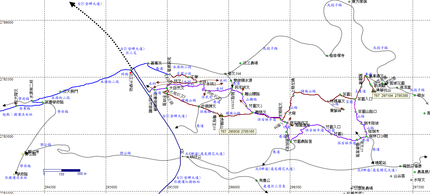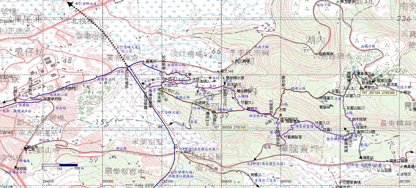 大自然香草飯店,位於淡金路(台2、登輝大道)金龍橋頭,這個登山口就在其旁的綠色地面小停車場旁。取右過金龍橋至淡江大學站搭車。H70m |