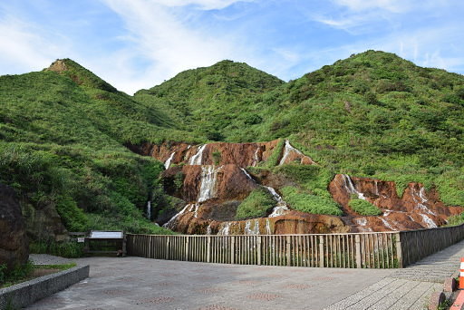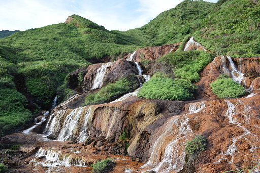 黃金瀑布,位於北34鄉道(金水公路)旁,設有小停車場與觀景台。『因為早期小溪上游採銅礦,礦砂沉積溪床,雨水經表層裂隙滲入礦體,與黃鐵礦及硫砷銅礦接觸,經氧化還原及鐵細菌之催化作用,形成高酸性礦水,最後再由地表排出,而形成金黃色的瀑布奇觀,...』H80m |