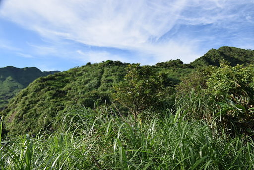 稜尾,可鳥瞰黃金瀑布,芒草山路偏左陡下。H158m |