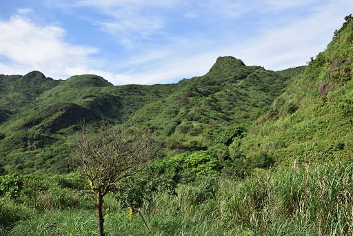 黃金瀑布瀑頂叉路,無標示,直行腰繞山路往黃金瀑布瀑頂、無言的山丘,右上攀繩陡上水螺稜,取右,登完水螺稜再繞前路回。山路一路往上,偶爾腰繞,路況良好。沿途可俯瞰金水公路、陰陽海,或眺望隔壁的城堡稜、長仁稜、煙囪稜,另一側則是壯觀的石尪山(基隆山東峰)。H106m |