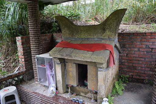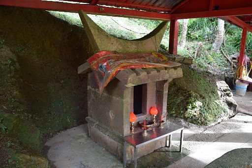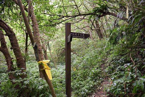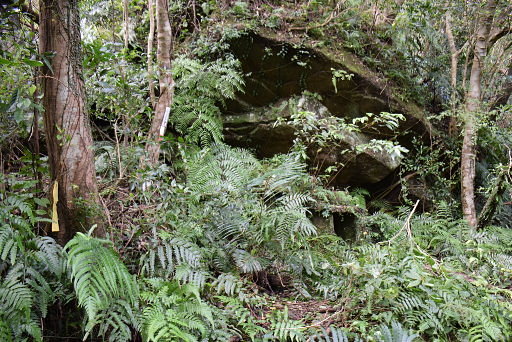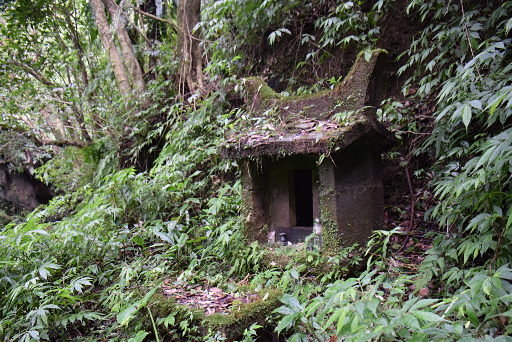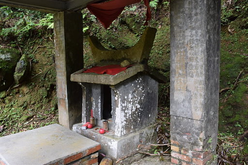 石硿子有應公,位於路右岩壁下方,藍天隊設有標示牌,不注意容易錯過。續行的古道路徑風倒木造成路徑略不清,開始取刀出來清理一下。H332m |