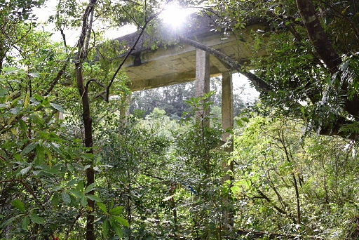 越嶺保甲路叉路,左下過橋為越嶺保甲路往大湖,直行為石硿子古道往盤山坑,前方可見煤礦水泥橋遺跡,右上可觀橋。直行。H277m |