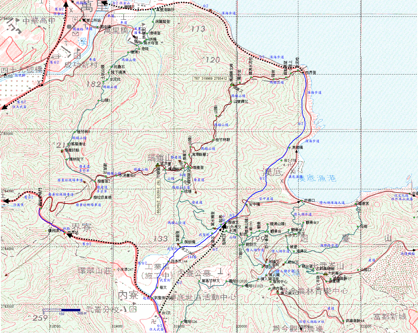 武聖街144巷口,右路(144巷)通往台2、外木山、大武崙漁港,直行可往瑪鎖山傳統登山口,直行至路底亦可通台2,這回選擇直行。H77m |