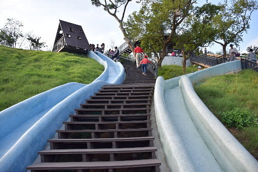 青青草原溜滑梯,四座磨石子溜滑梯,紅、黃、綠連成一線,然後再挑戰最長的藍色溜滑梯。H83m |