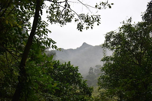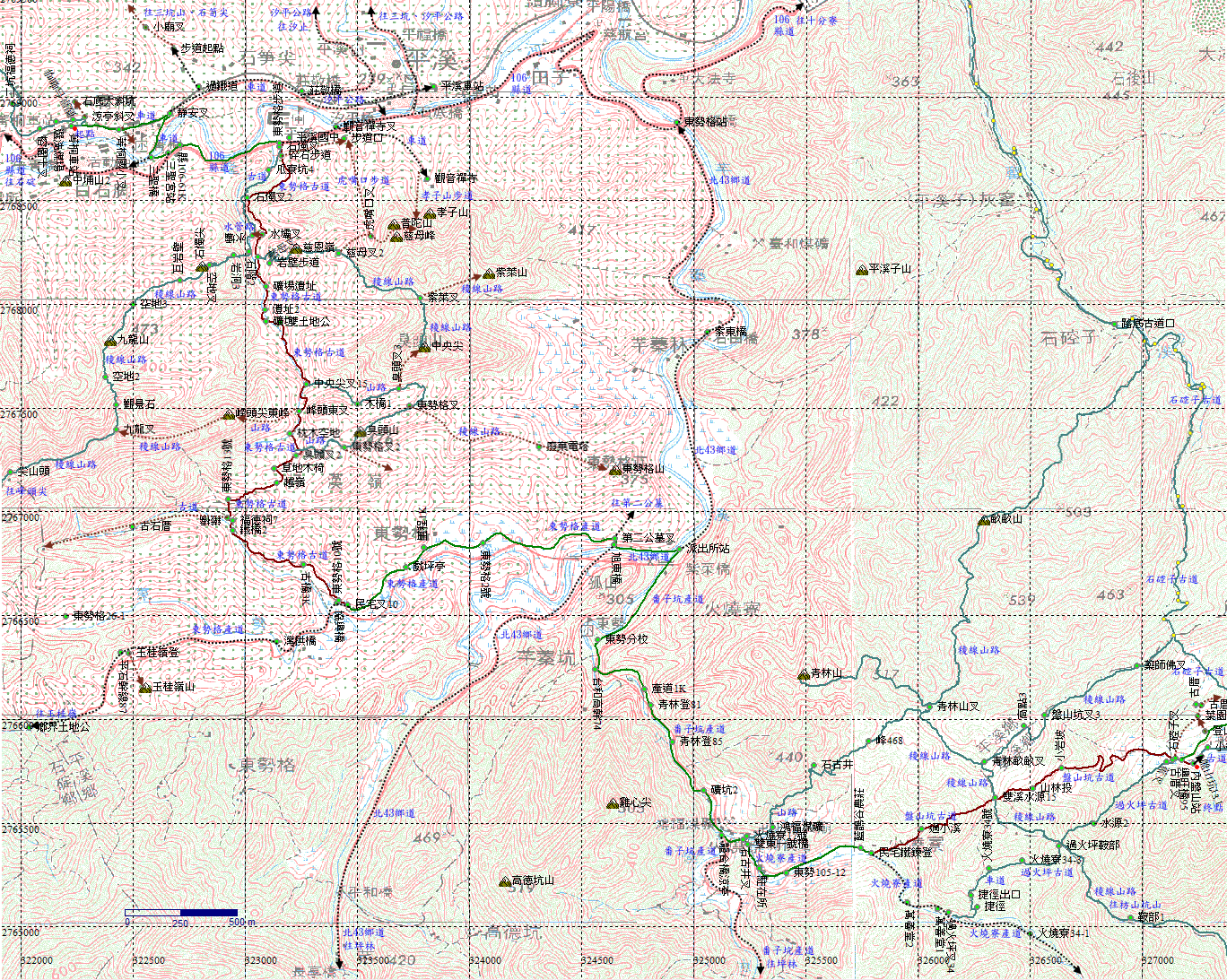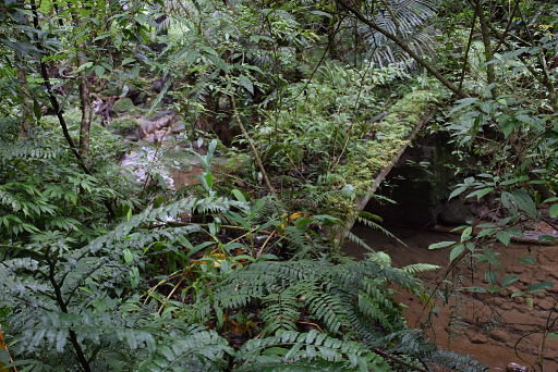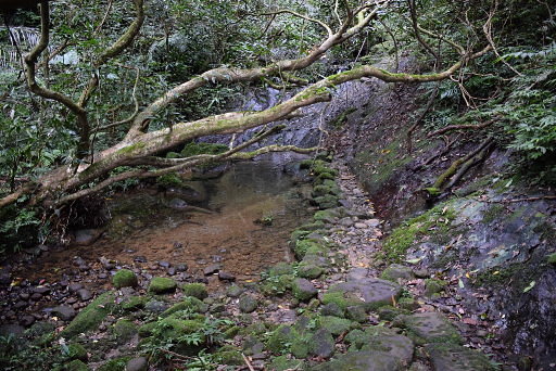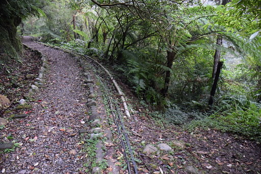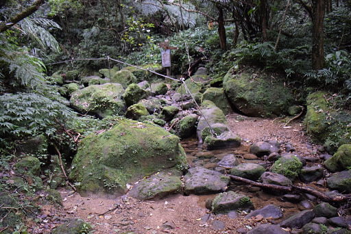 中央尖叉路,位於步道1.5K處,左過溪往中央尖約55分,續前行。古道仍循溪上行,溪石較為濕滑,架有繩索以策安全。H328m |