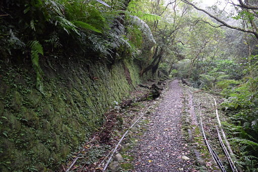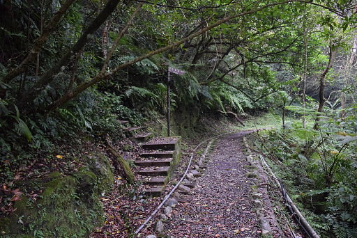 礦場遺址,設有木椅可休息。續行小段陡上,再轉為平緩寬大的台車舊道。H263m |