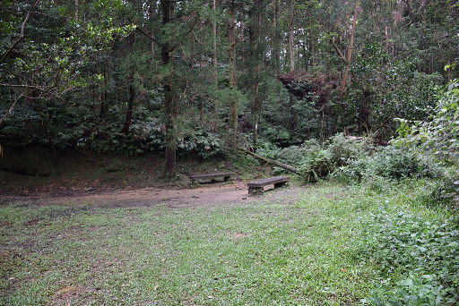 杉木林草地,設有木椅。古道往左繞上越嶺。H392m |