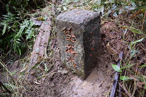 盤山坑古道越嶺鞍部,右側可見林產管理局山字水泥柱○一四號,左側的雙溪水源點卻看不見,原來躲在草叢裡面,雙溪水源保護區界15,台灣省政府民國76年設立。山路左往青林山,右往枋山坑山,直行下往盤山坑。休息。H467m |
