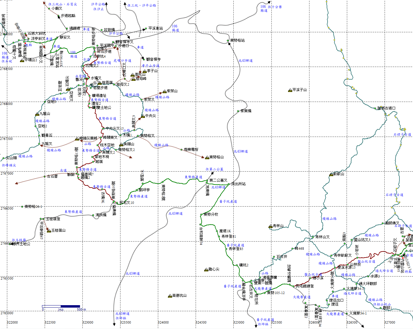 東勢格派出所站,可搭新北市免費巴士F822(平溪→東勢格派出所),每天四班車。這裡剛好是番子坑叉路口,取右往番子坑、火燒寮。H228m |