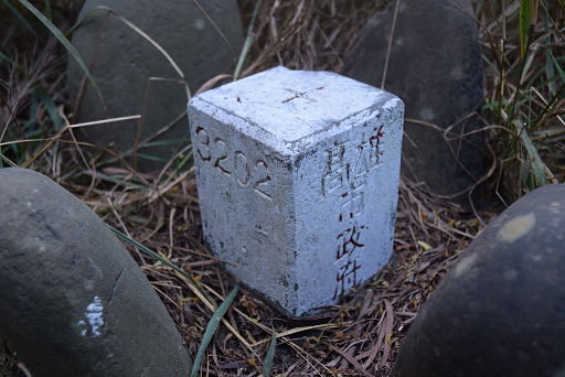 半屏山,174m,高雄市政府主控制點3202號。基石被漆成白色,且有護石,頗明顯。半屏山原本有三等三角點、三等陸補點,標高都超過220公尺,與現在的半屏山標高相差頗大,基石早已遺失,因此改以這顆主控制點為登頂標的。H170m |