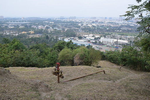 半屏山觀景台,左下木棧道下往翠華路萬姓公媽祠、山腰路,展望頗佳,可眺望左營、楠梓、世運主場館。續行稜線土石路有指標往好漢坡、碉堡。走沒幾步,在單槓的對面發現基石。H168m |