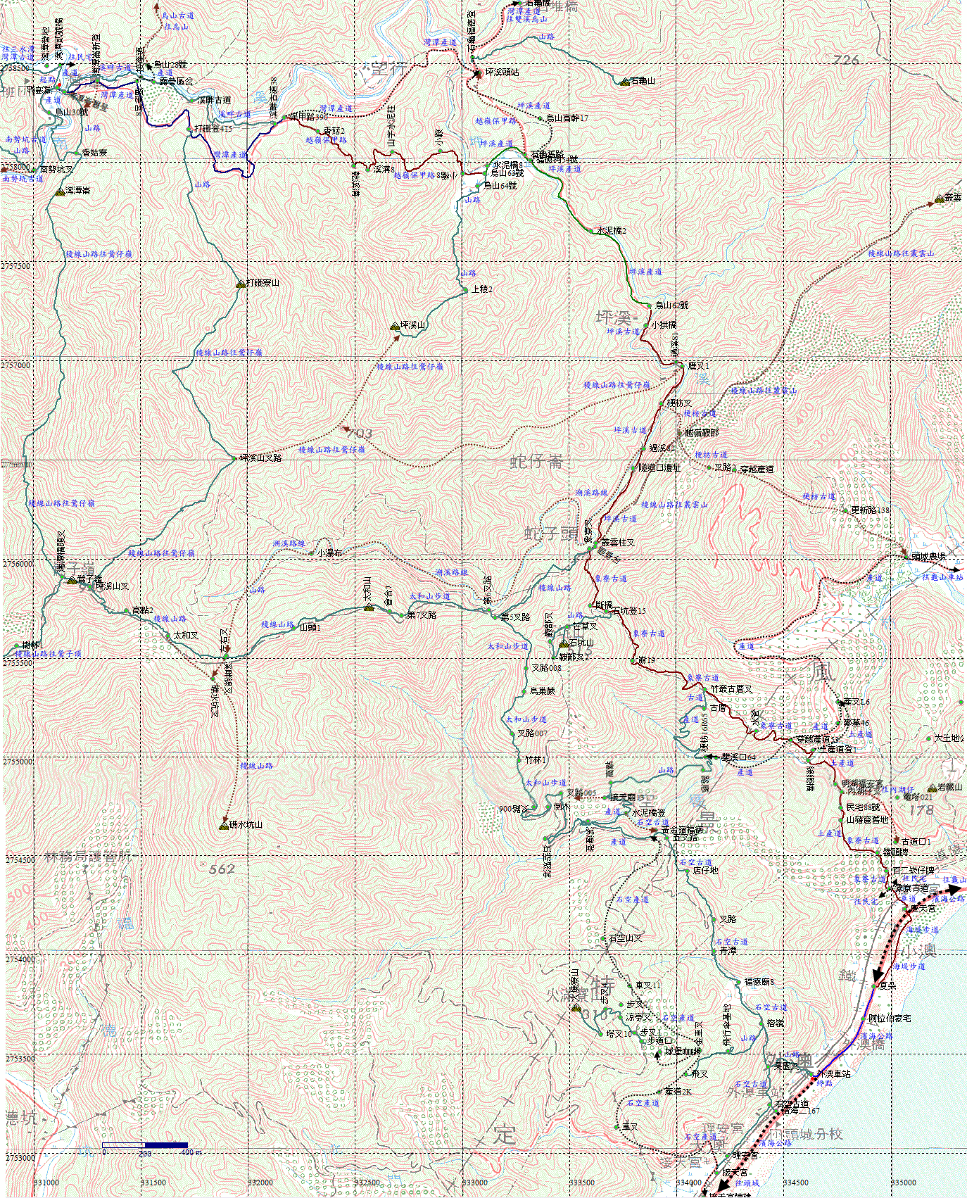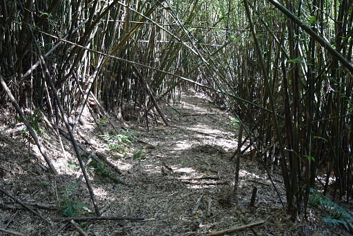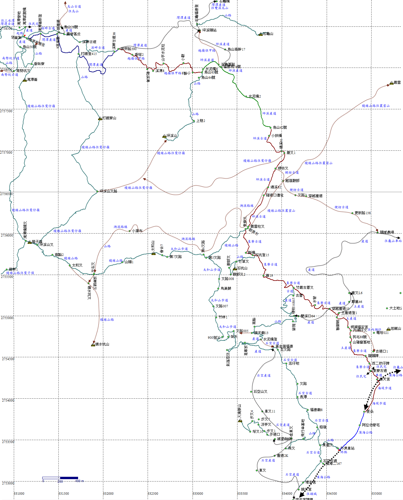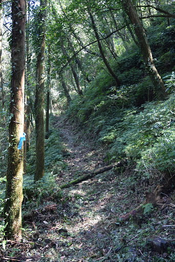 越嶺保甲路入口,與剛才的溪畔古道入口只錯開約20公尺,往坪溪口土地公、烏山54號約40分。三叉坑高分390電線桿。進入,古道路況頗佳。H447m |