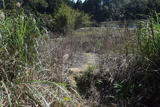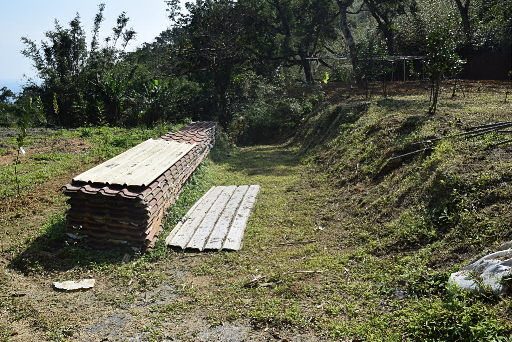 烏山63號民宅,古道出口位於民宅下方產道竹叢對面農地,產道右往坪溪山約50分,左往土地公、坪溪古道。休息。H463m |