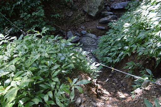 斷橋垂降過溪,原有的蛇木橋已崩塌,無法通行。過溪後右上有往石空山圖根點約10-15分的登山指標,但舊路已無蹤跡。H432m |