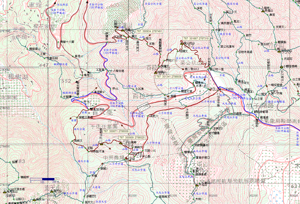 百拉卡公路叉路,右側山路可通先前的百拉卡山叉路,然後回烘爐山登山口。續前行,山路漸離稜線,轉為腰繞。H625m |