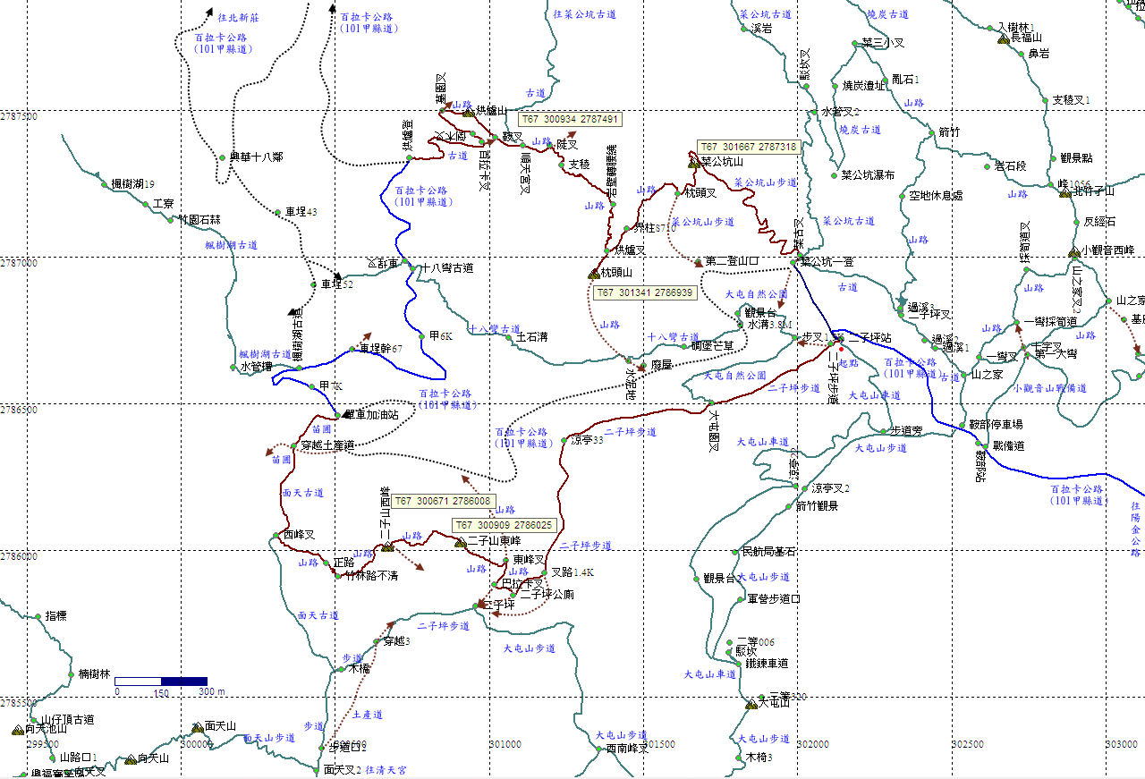 面天古道入口,阿和土雞城(鄉土味小吃),接上巴拉卡公路(101甲縣道)約7.1K,路旁設有單車加油站,取左循巴拉卡公路往北新莊方向,這條公路騎車者眾。H670m |