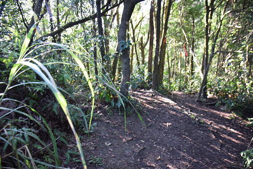 從淺山谷路回稜,循稜不久出現一些被砍伐的倒樹橫亙路中,之後居然登山路條回來了,雖然路徑仍荒涼,但有路條就好跟多了。H285m |