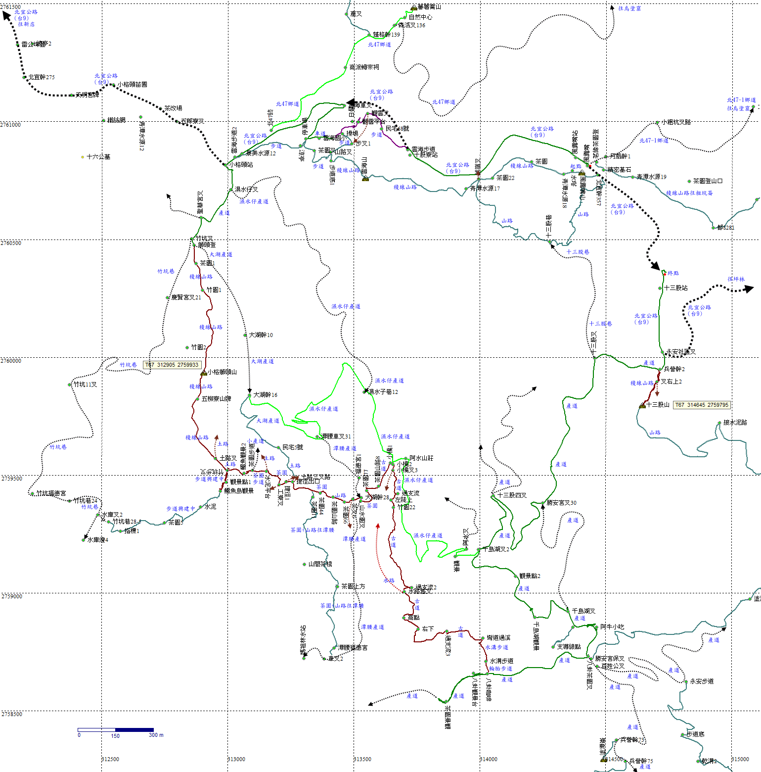 十三股山登山口,兵營幹2電信桿、鯉魚幹3電線桿,往十三股山約20分,今日的重頭戲,小恐龍騎車來共襄盛舉。很快就上稜,路況還不錯。H521m |