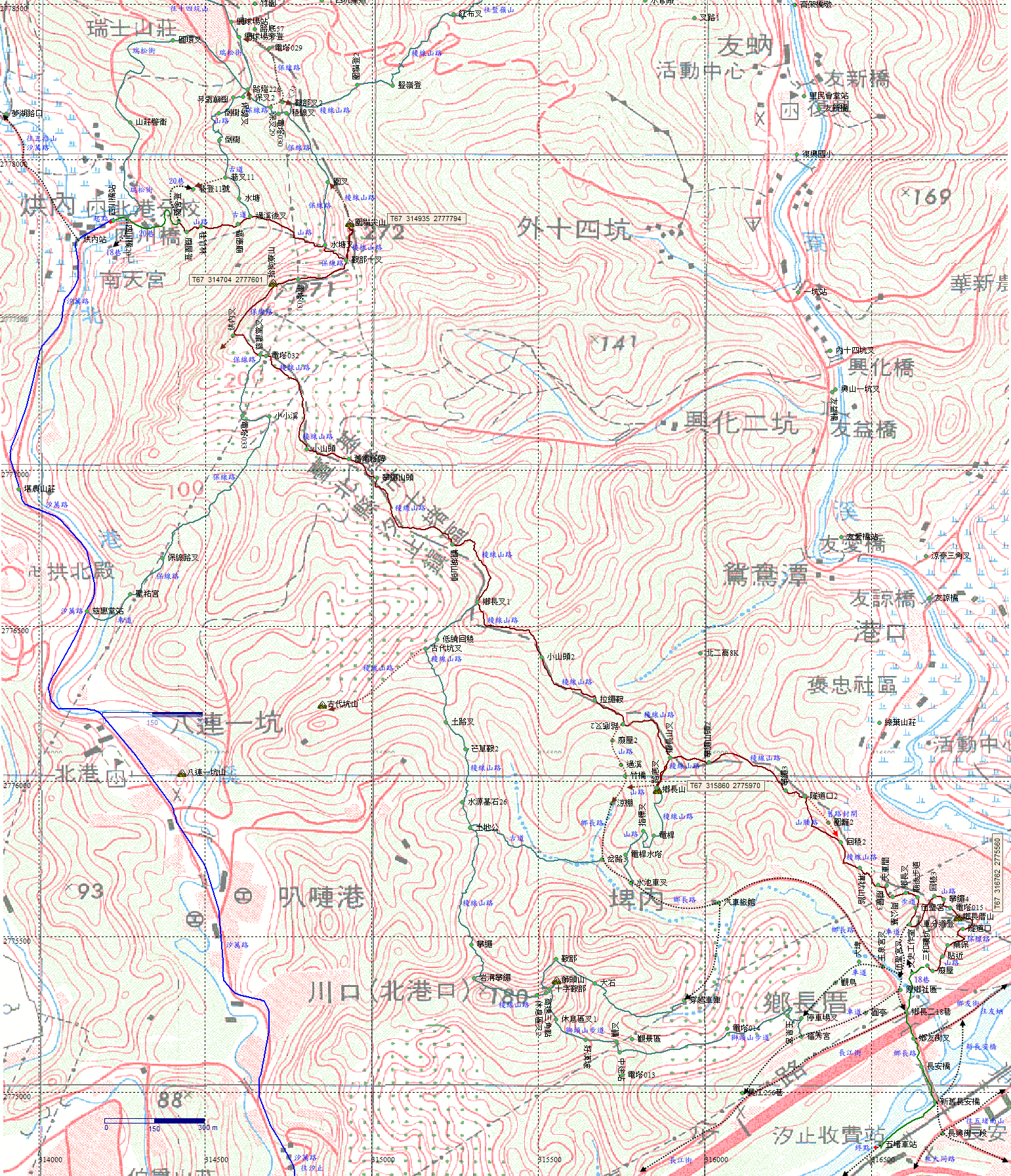 四川橋,過橋後瑞松街左彎,右側有18巷與20巷入口,取偏中間的20巷上山,往刣狗寮山登山口。H49m |