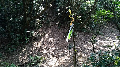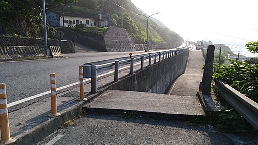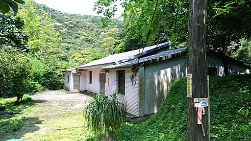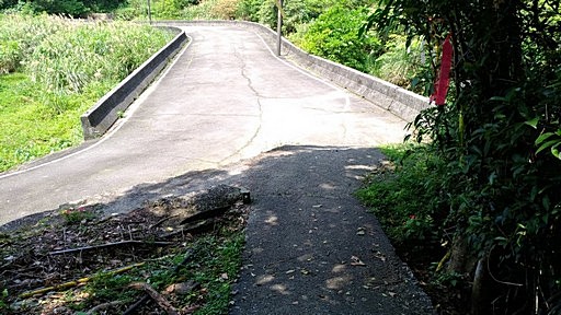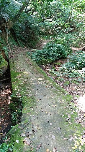 隆嶺古道南口,位於草嶺舊隧道南口上方的濱海公路上,民宅叉路口旁的擋土牆。行走擋土牆數十公尺後,山路開始往上。很快就接上一條水管路,不知不覺走到了路底的水塔,原來是錯過了叉路口。H33m |