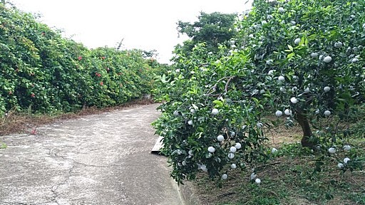 柑園叉路,左側水泥小車道上往柑園,路右有間公廁,進入柑園登崩崁山,全程無登山路條。柑橘仍綠油油的,但有些果樹上面的柑橘都被塗成白色,不知有何用意?循著柑園主要路徑迂迴往上,漸漸上稜。H219m |