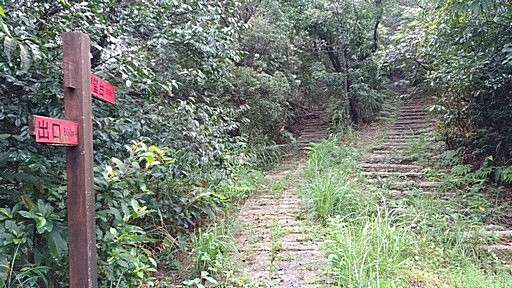 步道叉路,左右兩條石階步道都是往山頂方向,步道指標往瞭望台80m,回出口600m,這個點其實是更早以前的中股山叉路,新步道建成之後,跟著往南移。選了左線,結果居然在山頂下方遇芒草區,且倒樹橫陳,砍了一下後決定退回改取右線,右線一路順暢登頂。H253m |