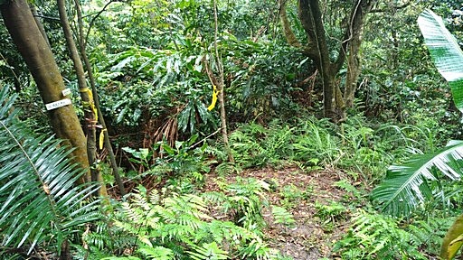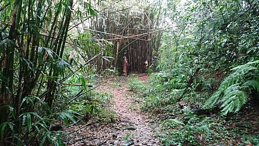 主稜鞍部十字路口,淡基橫斷古道在此越嶺下往崁腳,左往七分寮山約40-45分,右往開眼尖山約45-50分,直行往裕大橋、崁腳約60-70分,往崁腳方向深入約三十公尺,竹叢邊可見瑪鋉溪水源保護區界04。H342m |