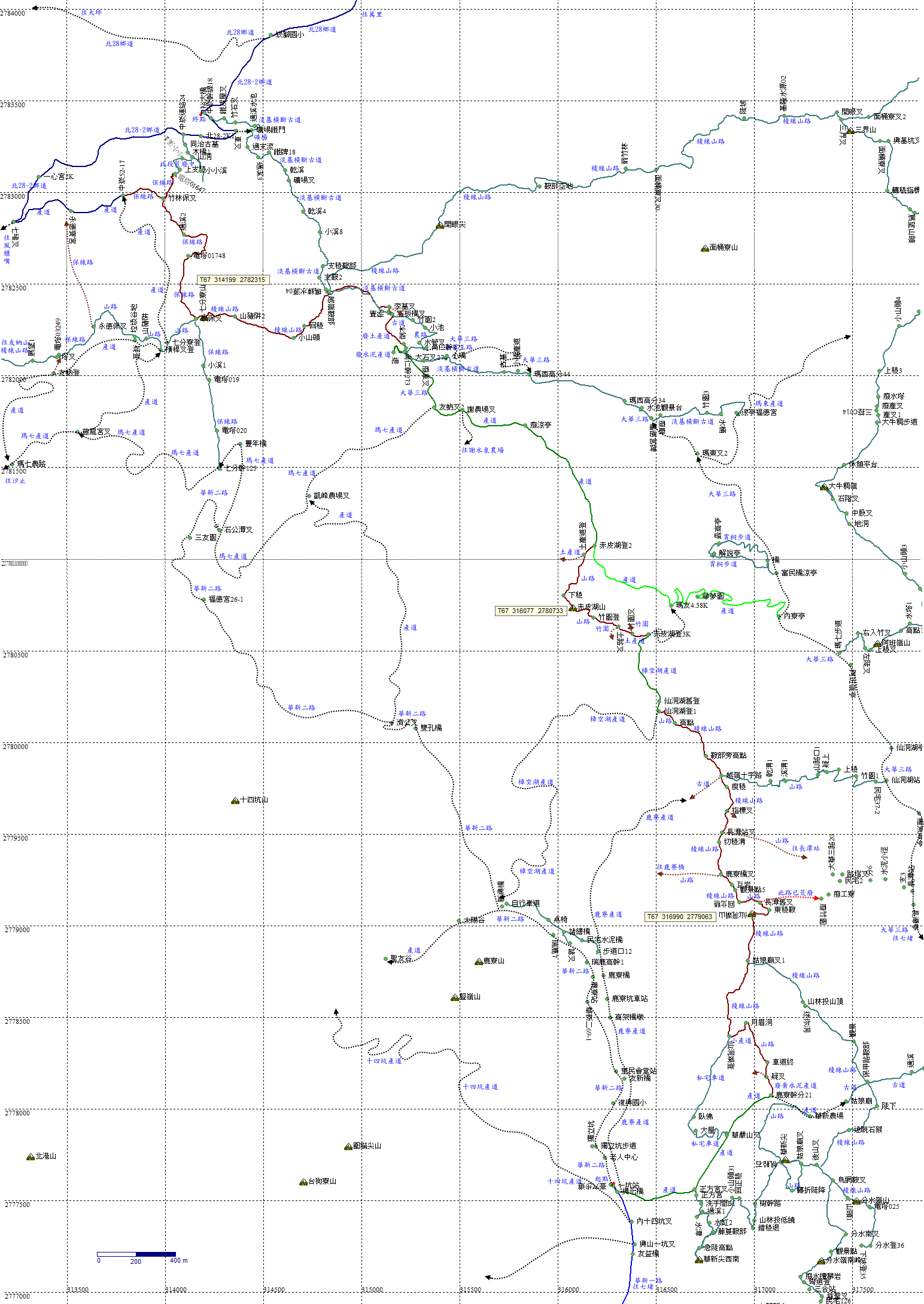 電桿271叉路,右往大華三路電桿#271,取左。古道路線轉趨明朗。H303m |