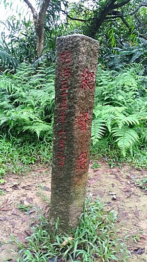 總督府一區域標第五號,明治三十五年六月三日。石柱設於支稜上坡中途。總督府區域標跟陸軍省基隆要塞地帶標應為類似性質的界標,目前僅發現兩根,另一根在瑞芳上天福安宮(粗坑頭崙、二區第九號、已斷成數截)。這條總督嶺古道就是因此柱而得名。續行步道陡上。H130m |