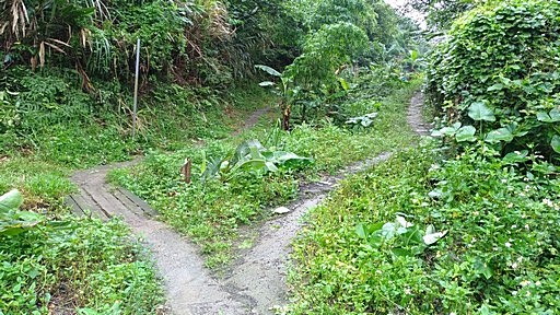 巷底登山口,車庫旁進入菜園小徑。剛進入即分左右兩線,右線為主,取右為佳。一路循菜園小徑往前。中途有連絡小徑,與剛才的左線相近。H60m |