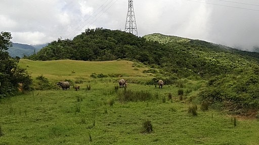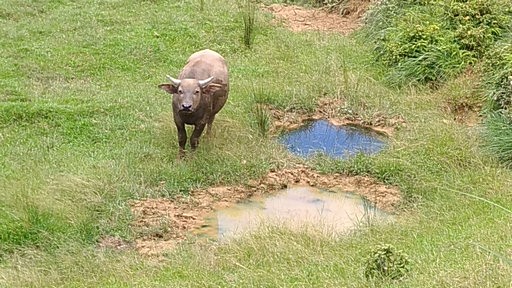 牛隻擋道,總共有五隻水牛,二老一青二小,草原狹長,硬闖繞過恐有危險。最後牠們派出胡青牛緊盯著我,其他牛繼續吃草。我乾脆在高處坐下來等著。 |
