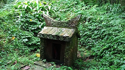 土地公鞍部,十字路口,左為大溪線步道往大溪河濱公園4.1公里,右側為古老的石砌小土地公廟,福德祠。廟前循稜可往鹿窟尾尖,廟前越嶺而下是桃源谷山腰路,較少人走,但卻是古道正路。續行,循草坡稜線山路往鹿窟尾尖。H504m |