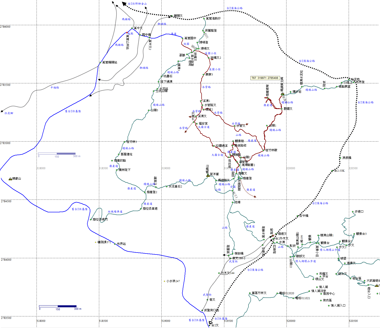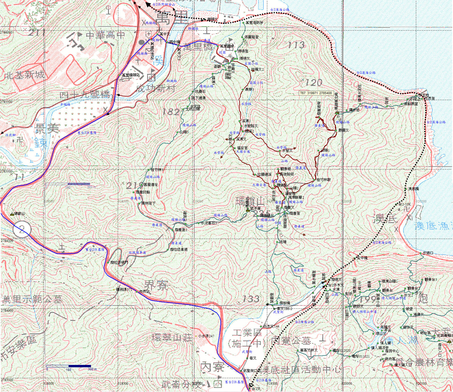 06:28 直行山谷菜園小徑。  06:33 農寮。  06:38 水管路叉路。  06:41 大嶺古道叉路。  06:43 大嶺古道福安宮。  07:14 涵管堆。  07:37 稜線眺望萬里國中、翡翠灣。  07:37 稜線眺望萬里國中、翡翠灣。  08:10 眺望基隆嶼。  09:12 回到桂竹林鞍部。  09:34 過小溪。  09:45 眺望瑪鎖山。 | [圖文分列式|圖文穿插式]  GPS軌跡圖 [無底版] GPS軌跡檔:[GTM][GDB][GPX]  06:24 萬里國中。  06:26 溪邊步道繞至活動中心後方。  06:26 水井汲水器。   06:27 高高的水塔。  06:27 校舍後方小徑往山谷菜園。  06:30 第二座拱橋。  06:36 水管路。  06:37 溪溝前叉路。   06:39 水管路。   06:43 福安宮。   06:52 偶可見古老的石階。   07:07 碎石坡拉繩。  07:17 廢產道主線叉路。  08:06 桂竹林鞍部。  08:24 接近瑪鎖山東北峰時有不少壕溝。  08:26 瑪鎖山東北峰,194m,海軍N049水泥基石。  08:32 紅色塑膠繩叉路。   09:17 腰繞廢產道。  09:21 水管路叉路,接上黑色水管路。  09:35 回到水管路主線之雙水管路叉路。  09:44 回到萬里國中。 | ||||||||||||||||||||||||||||||||||||||||||||||||||||||||||||||||