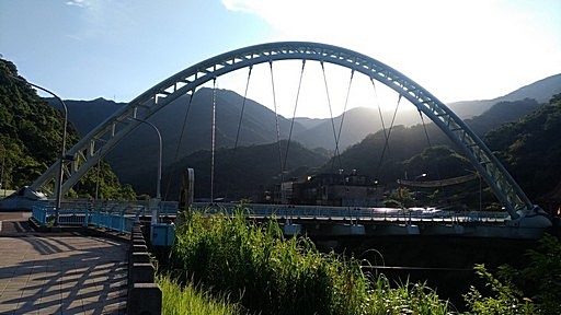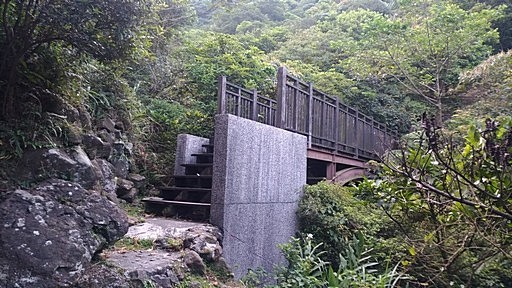 介壽橋,橋上眺望獅子嘴岩角度佳。過橋後可見介壽橋紀念碑,取左經猴硐路往金字碑古道。附近有兩條步道可上猴硐神社。H101m |