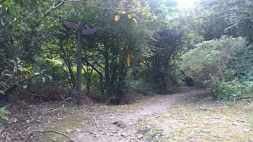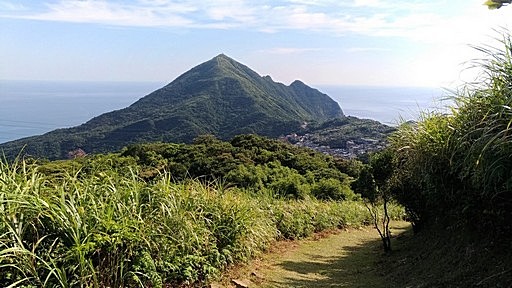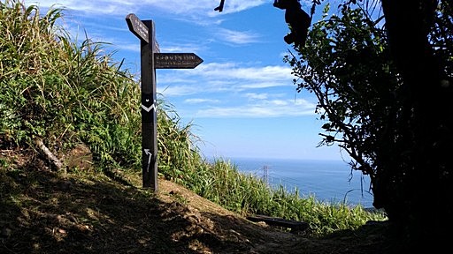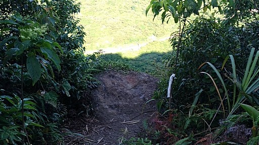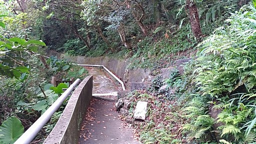 粗坑口瞭望台叉路,有根電線桿,左往粗坑口瞭望台100M,直行往九份(頌德公園),這裡就是小粗坑聚落,因金礦的發現而形成的礦業小聚落。取左,腰繞小徑雖不如古道主線寬敞,但路況尚佳。H291m |