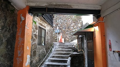大竿林福德祠叉路,右上階梯往大竿林福德祠,無標示,直行往九份國小,左下有小柵門,取右。H323m |