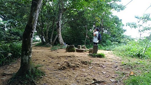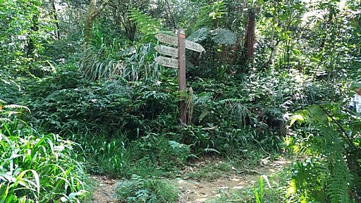 基座旁叉路,左側有基座遺跡,右下往勞工育樂中心、觀世音菩薩像,取左,經過基座往石門山。H546m |
