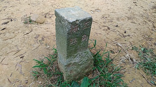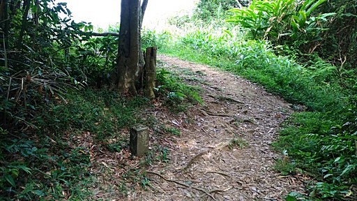 小粗坑山(粗坑山),502m,水泥柱。樹林間無展望,有棵大松樹。續前行˙。稜線山路中途有根石保界柱。山路漸漸往左偏下稜,與十幾年前的路線不同。H506m |