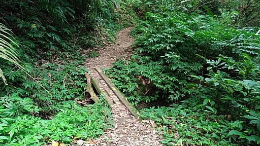 小橋,附近轉為古道小徑,一路循溪左岸緩下。H368m |
