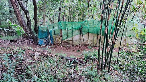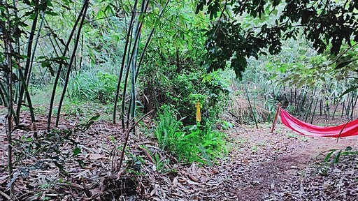 竹園入口,紅布擋道,正路應取左往另一竹園再往下,因無登山路條導引,誤入竹園。走了一段才發現已偏離航跡,退回紅布入口附近,但仍循這座竹園邊往下。H163m |