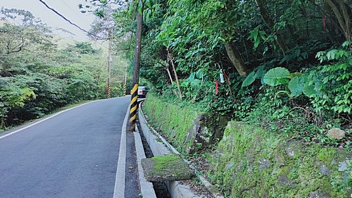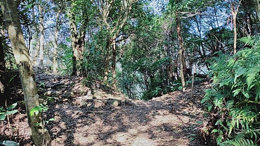 雙溪山登山口,位於擋土牆缺口,舊路新開路況佳。至善幹64電線桿。一開始是一階階的駁崁地,後來略往右繞再上稜。上稜後路趨緩。H293m |