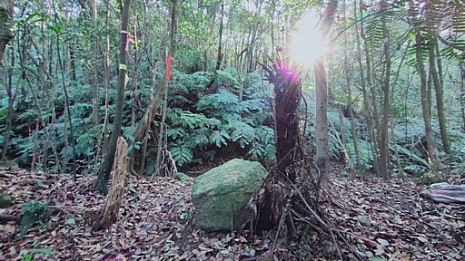 梅花山北峰叉路,左側為大石觀景點,展望頗佳,可眺望雙溪山、尾崙山。直行往雙溪溝古道入口,右上山路無登山路條,陡上往梅花山北峰。觀景後取右上,路況還好,不久才開始出現路條。H537m |