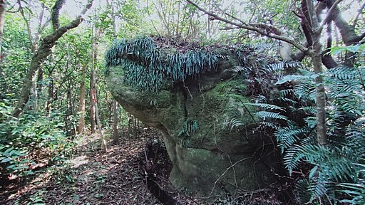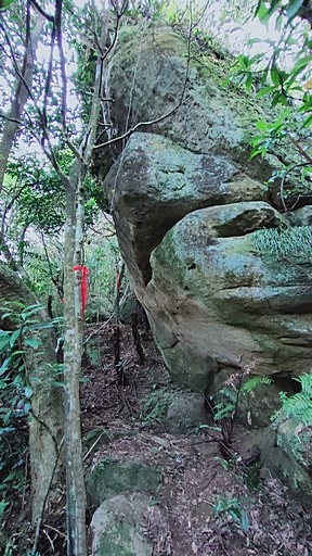 梅花山十字路口,山路穿越雙溪溝古道,左往風櫃嘴,右往碧山,直行,為梅花山西稜新路。不久山路往左繞。經岩壁下。H564m |