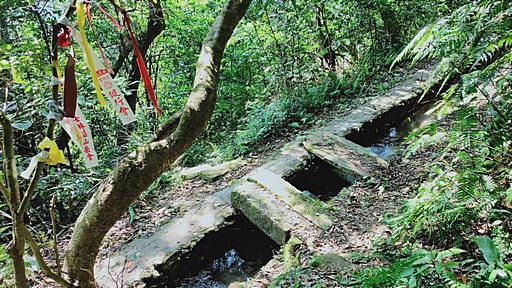 石板橋,左往梅花山新路,右側過溪是上回探路的方向,取左。這條路明顯是古道,沿途有不少石階與小石板橋,一路循谷線緩上。H457m |