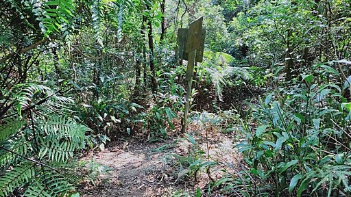 禁葬告示牌,告示牌旁左有明顯山腰路似乎是下往天溪園,取右轉腰繞。H375m |