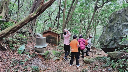 磚造小土地公廟。不久出樹林,此後無遮蔽,石階步道轉陡。 |