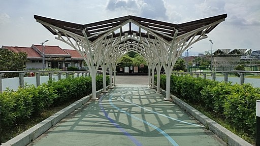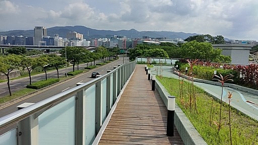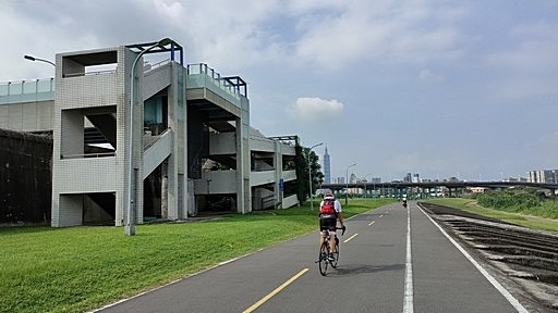 自行車牽引道,銜接彩虹河濱公園與內湖運動公園,雖有其他跨堤步道可走,但堤頂大道不好過馬路。循高架引道往內湖運動公園。H14m |