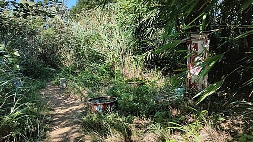 長草區,根據山友記錄應該有個墳墓,但是草長得太茂盛,看不出來,山路亦不明顯。接近稜線前山路右轉,路況略好轉。H279m |