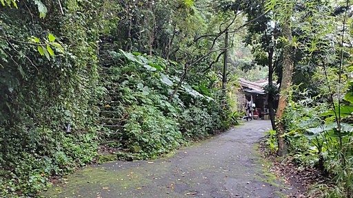 大青坑產道路底,左側鐵門內為私人農園,步道穿越產道往幸福休息站、北天宮。H327m |