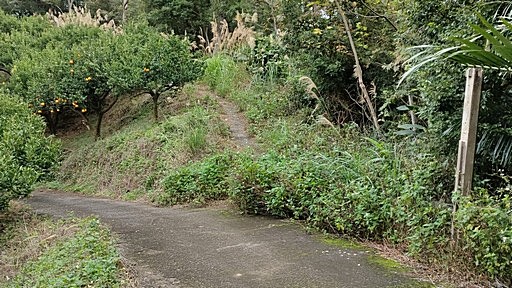 二確山叉路,左下為水泥農路,往濕地農場,直行為稜線山路往二確山,路條已被拆除,直行。稍後出現另一座果園。H366m |
